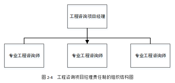 根据签订工程咨询服务合同,从事全过程工程咨询服务的咨询单位需要构建与项目特点相适应的组织体系,导则中把单独构建的组织体系称为工程咨询服务机构。工程咨询服务机构主要采取工程咨询项目经理责任制,这也是全过程工程咨询服务组织的核心特点。工程咨询项目经理由工程咨询服务单位的法定代表人书面任命,工程咨询项目经理必需具有与工程类别和工程规模相适应的工程建设类的国家注册执业资格,并在工程咨询单位注册,也可以是省部级及以上专家委员会工程类专家。更换工程项目经理时,必需征求建设单位的同意。同时,导则明确了工程咨询项目经理职责。在工程咨询项目经理下,设专业工程咨询师,在工程咨询项目经理的授权下工作,主要负责编制各个阶段、各专业或各类专项管理工作的操作性文件,如《专业(专项)工程实施细则》,专业咨询工程师可以兼任相关岗位,主要有:安全管理岗;质量管理岗;技术管理岗;造价管理岗;建设协调岗位;进度管理岗;物资管理岗;合同管理岗;工程信息及档案管理岗位??杉?,工程咨询项目经理责任制下,专业咨询工程师不仅可以做咨询,还可以兼任管理岗,是一种咨询和管理相结合的模式,有利于咨询成果的推行,也有利于合同的执行和项目目标的实现。工程咨询项目经理责任制的组织结构见下图2-4。